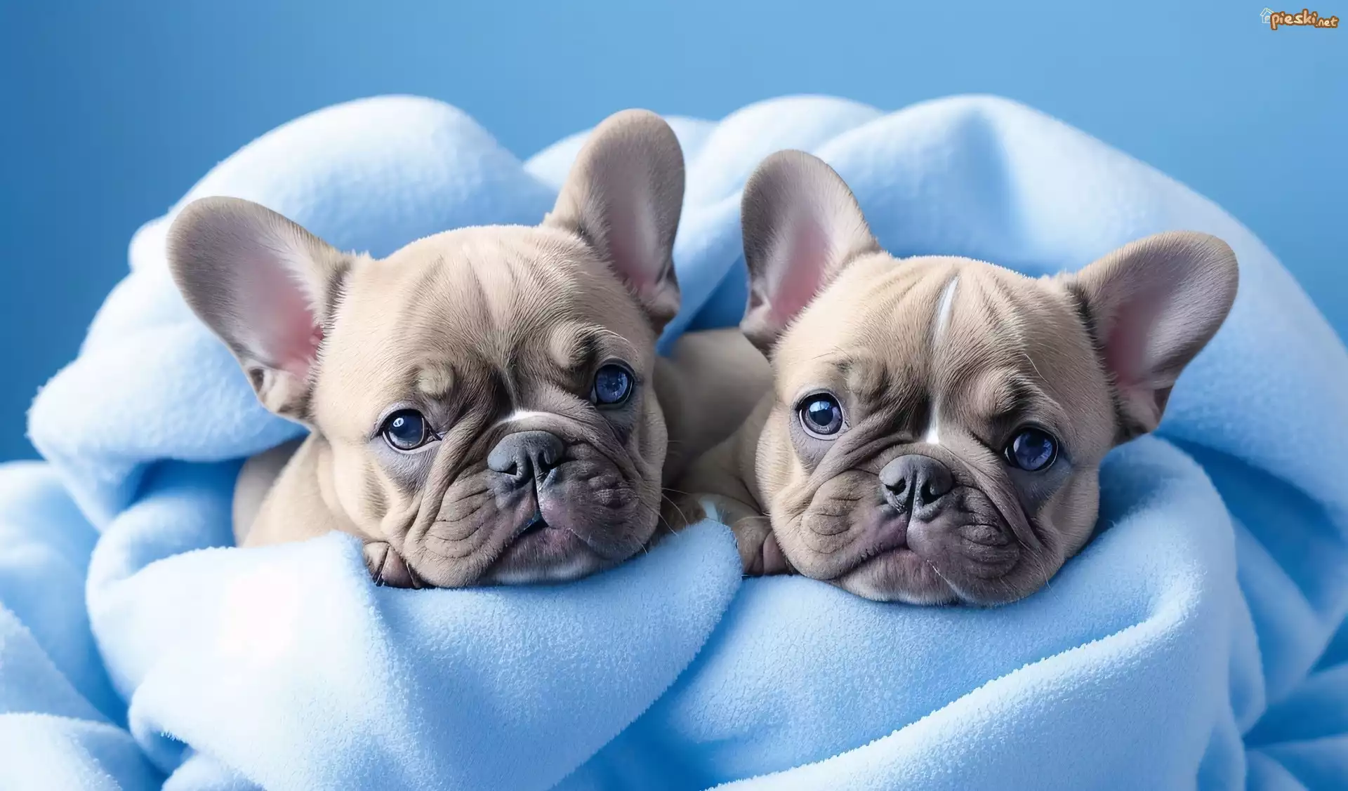 Pies Psy, Buldog francuski, Szczeniaki, Błękitny, Koc