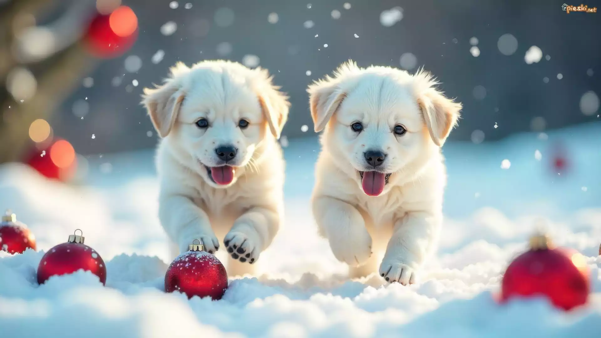 Pies Dwa, Białe, Psy, Szczeniaki, Śnieg, Bombki, AI