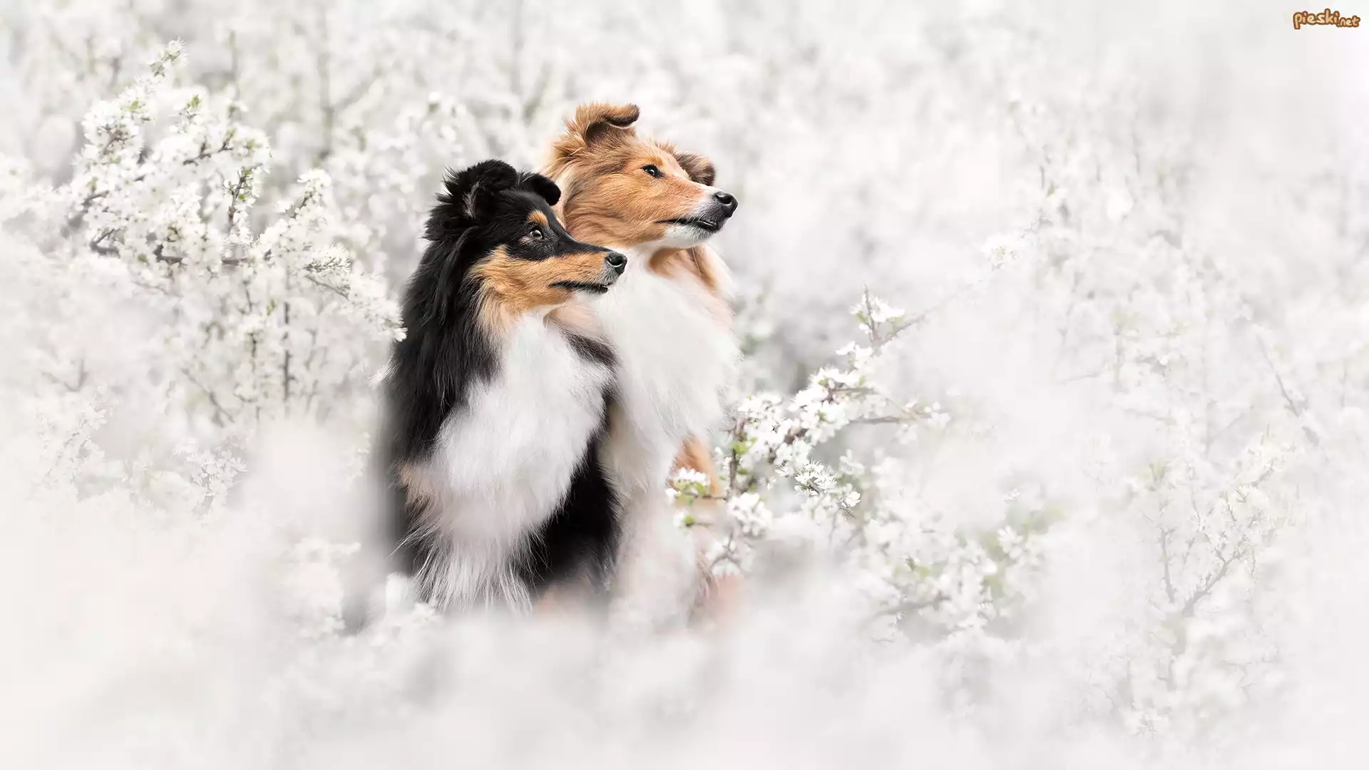 Psy, Dwa, Owczarki szetlandzkie, Kwiaty, Białe