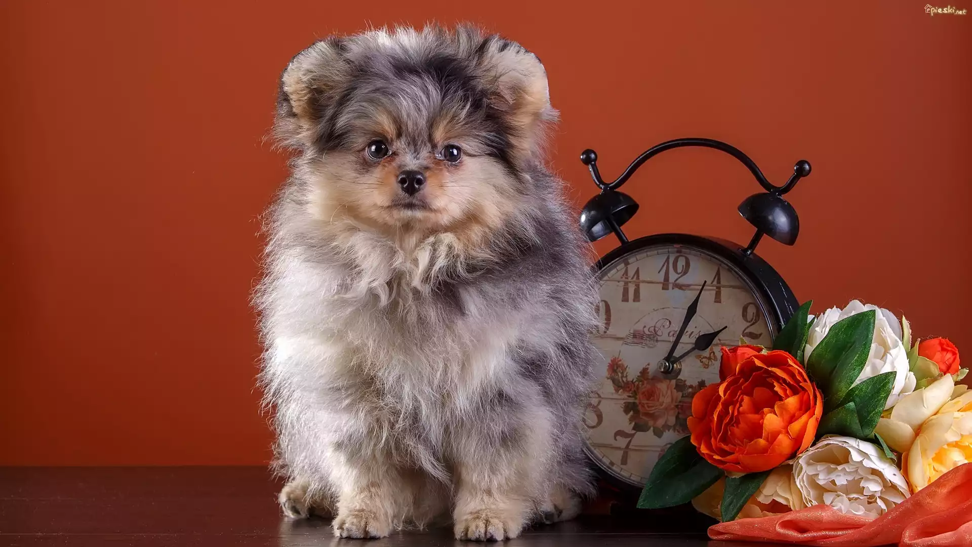 Szpic miniaturowy, Szczeniak, Budzik, Kwiaty