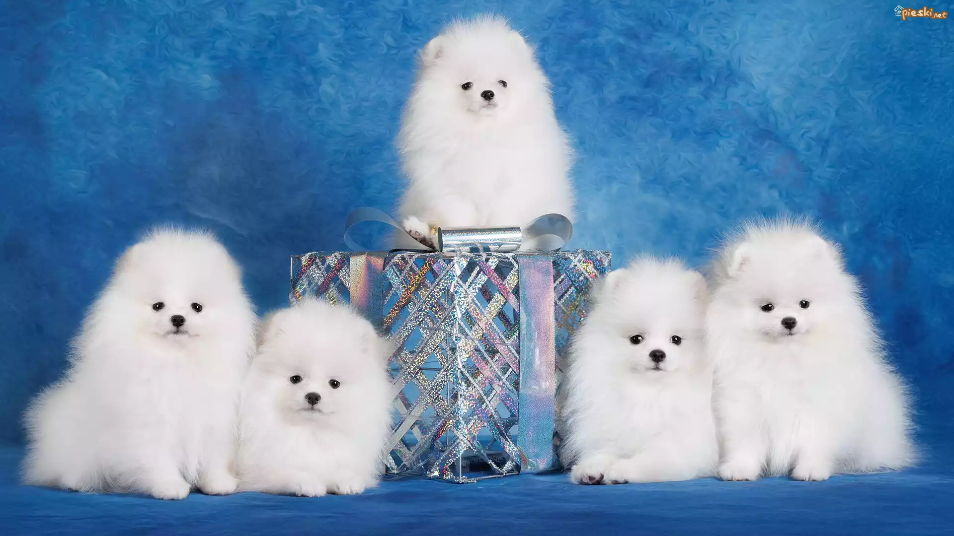 Psy, Szczenięta, Białe, Szpice miniaturowe, Prezent