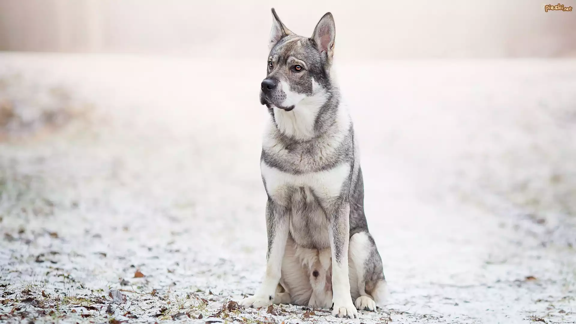 Pies, Szwedzki elkhund, Liście, Śnieg, Rozmyte, Tło