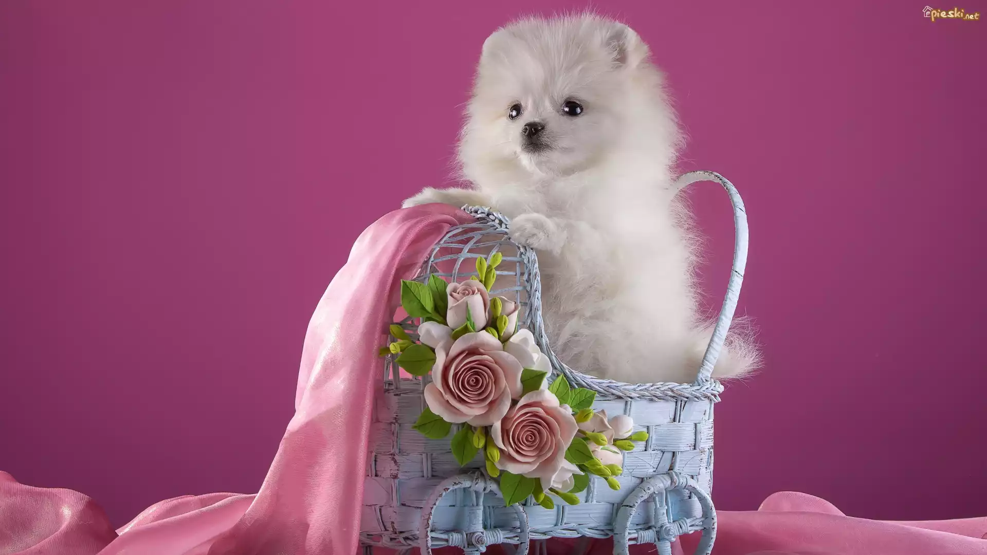 Pies Szczeniak, Biały, Szpic miniaturowy, Wózek, Róże, Różowy, Szyfon