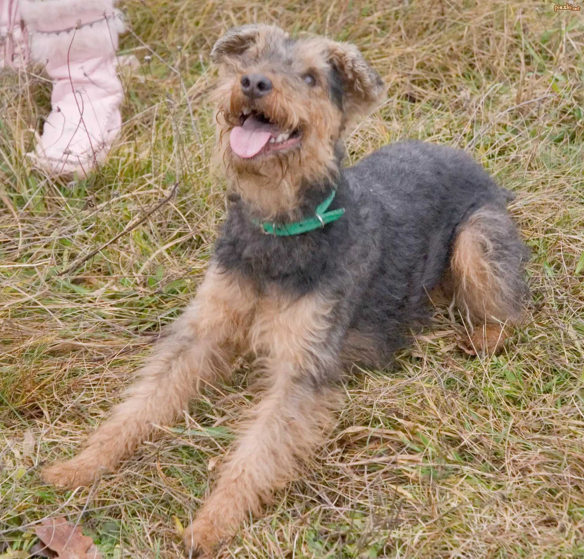 Terier walijski, czarna, podpalana, maść Terier, Walijski, Trawa Terier walijski, zielona, obroża Chłopczyk, Terier walijski, Zima Śnieg, Zima, Dziecko, Terrier walijski
