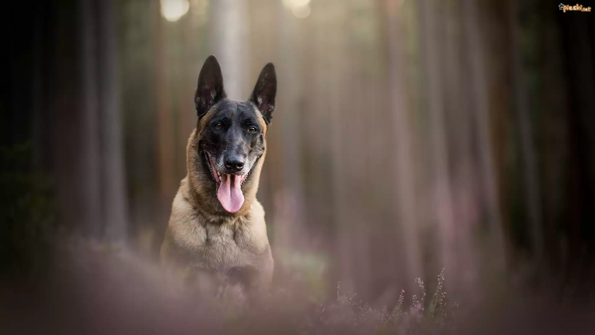 Pies Pies, Owczarek belgijski malinois, Mordka, Jęzor, Wrzosy, Rozmyte, Tło
