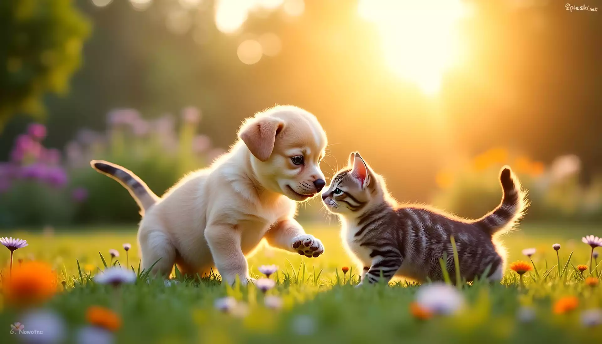 Pies Szczeniak, Pies, Kot, Trawa, Grafika AI