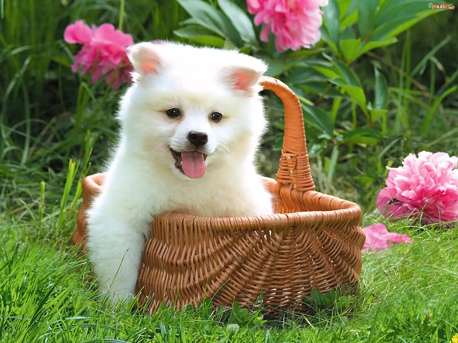 Trawa, Kwiaty, Koszyk, Piesek