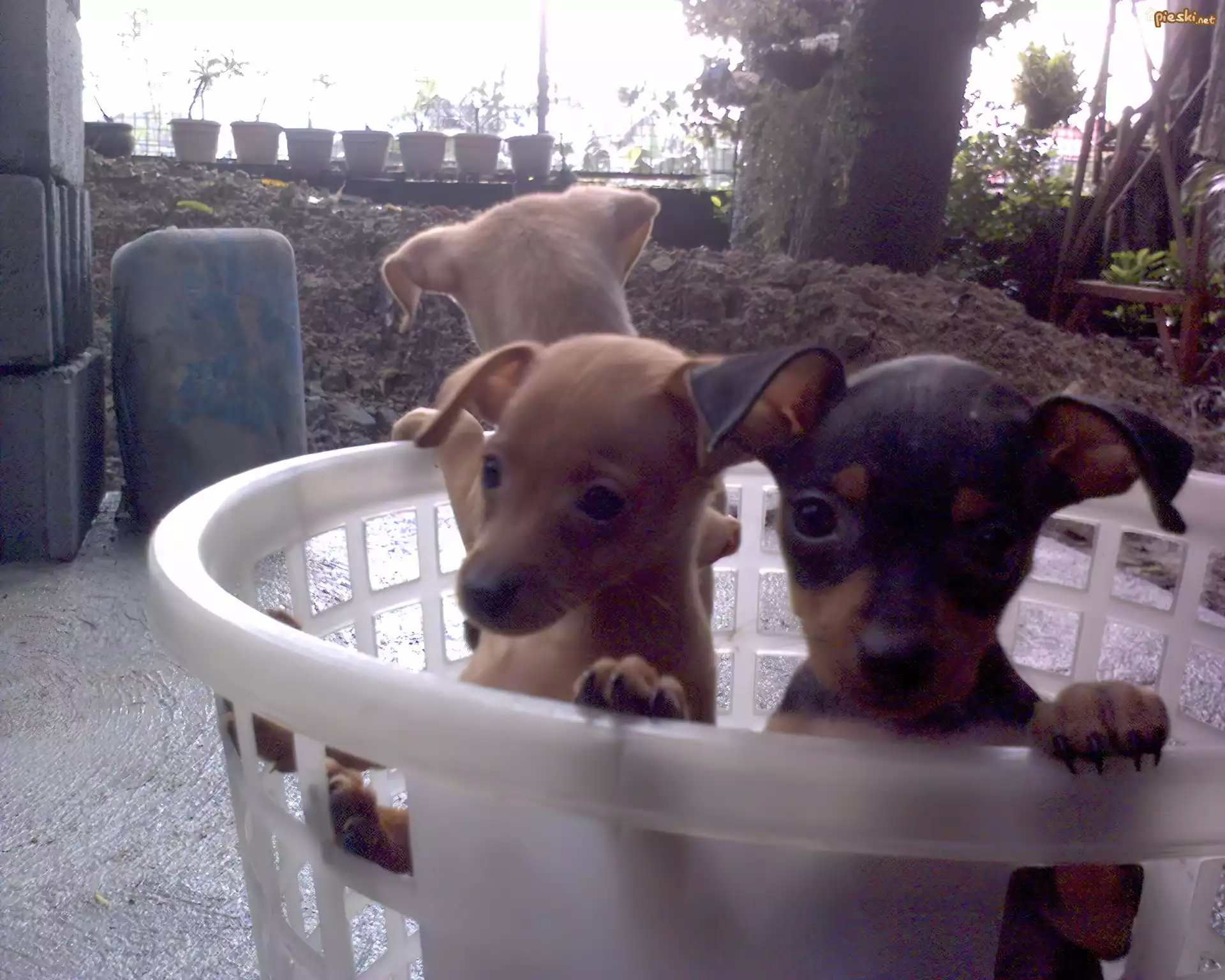Pies trzy, małe, pinczery miniaturowe