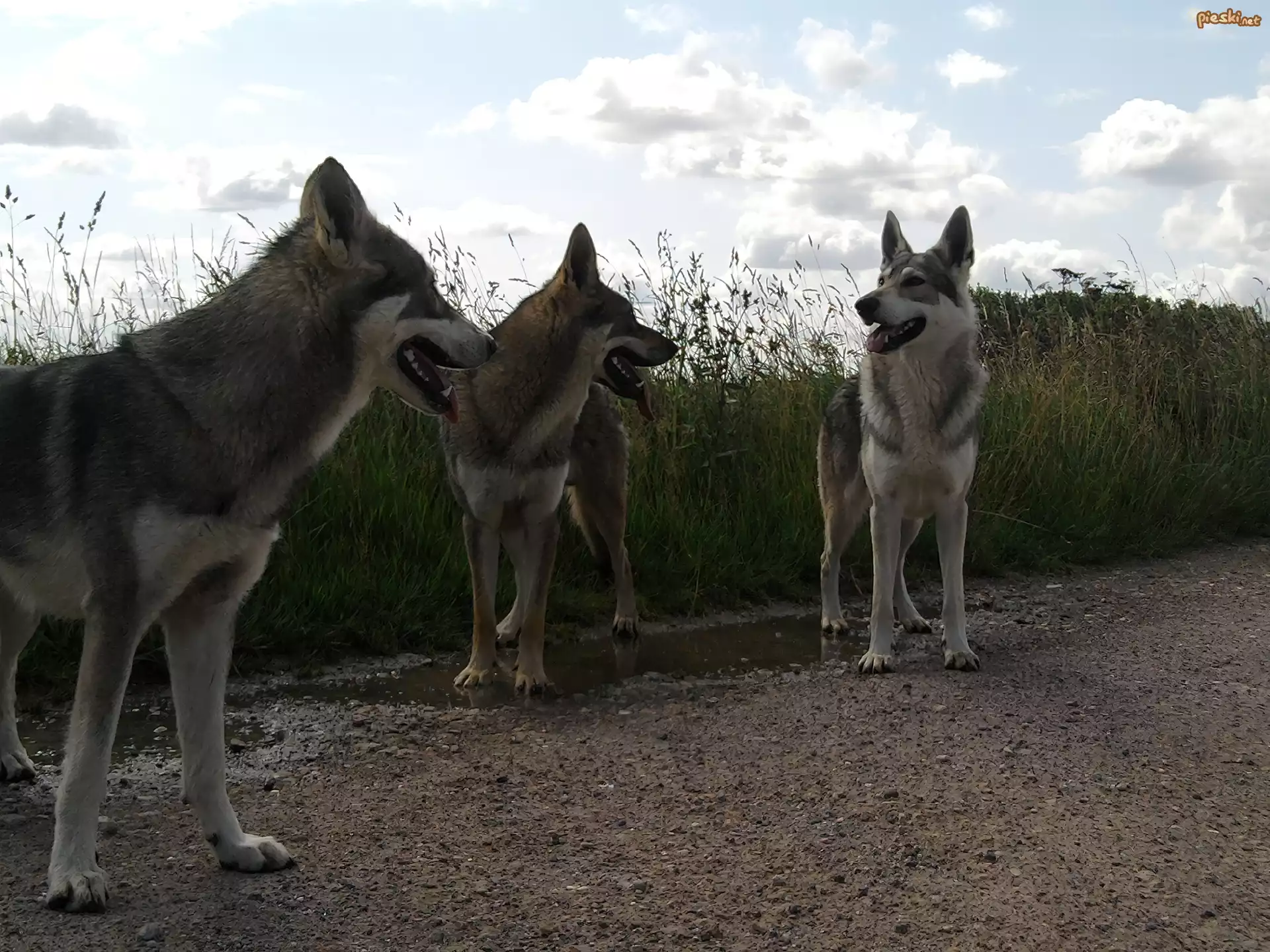 Dwa, Psy, Zabawa, Woda Saarlooswolfhond, las, śnieg Saarlooswolfhond, śnieg, krzaki Saarlooswolfhond, woda trzy, Saarlooswolfhond Saarlooswolfhond, łąka Saarlooswolfhond, wysoka, zielona, trawa postawione, uszy, Saarlooswolfhond