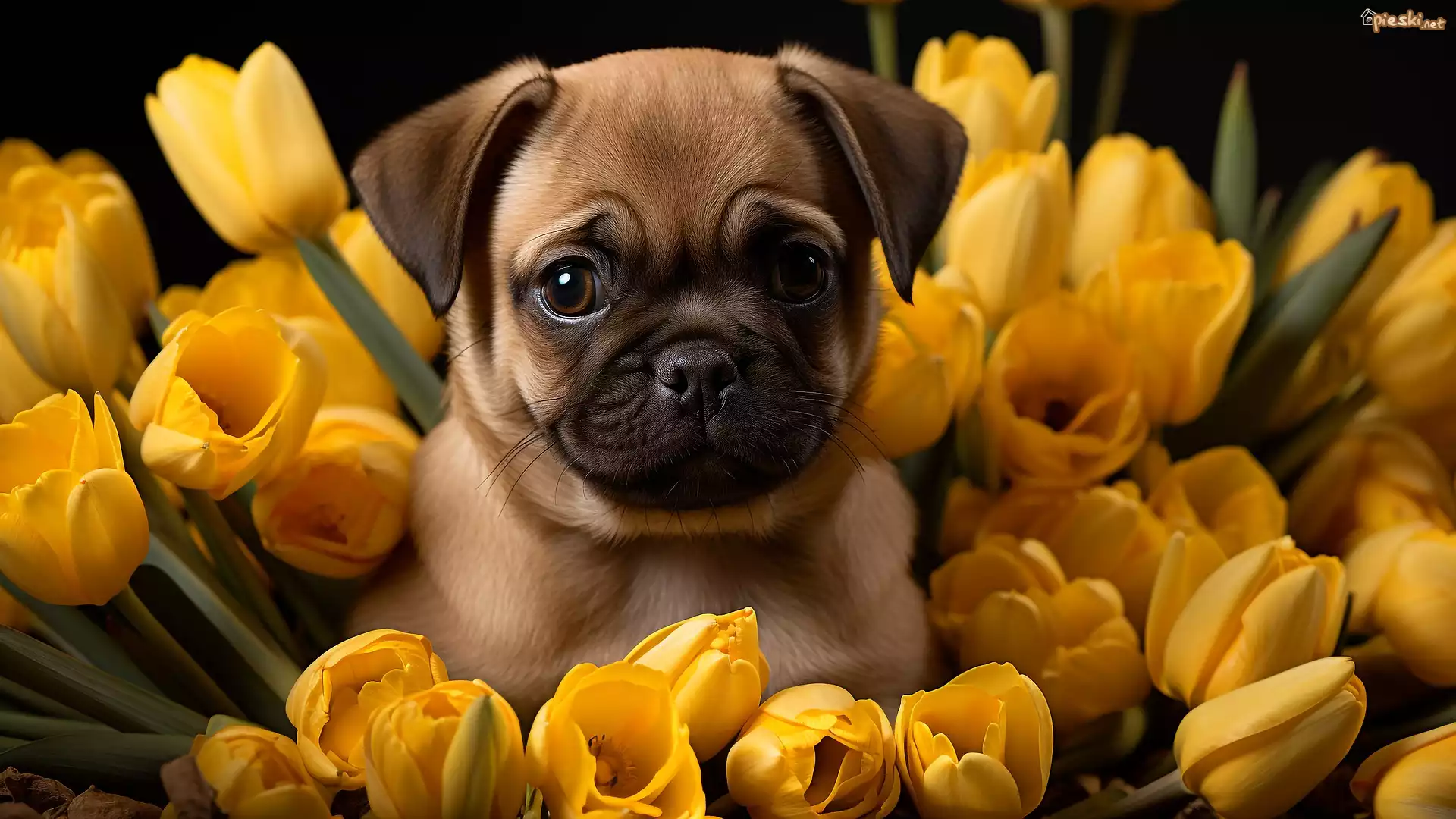 Pies Szczeniak, Mops, Żółte, Tulipany