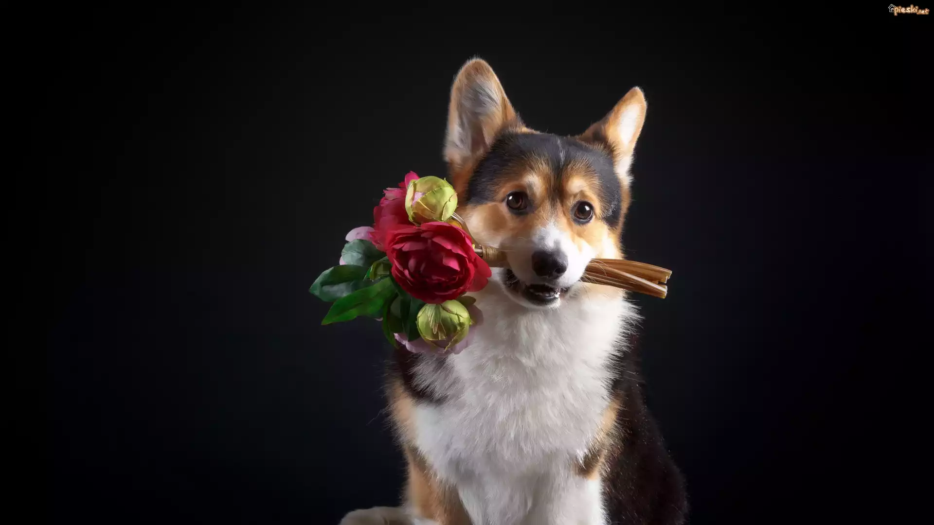 Pies, Welsh corgi pembroke, Bukiet, Kwiaty, Ciemne tło