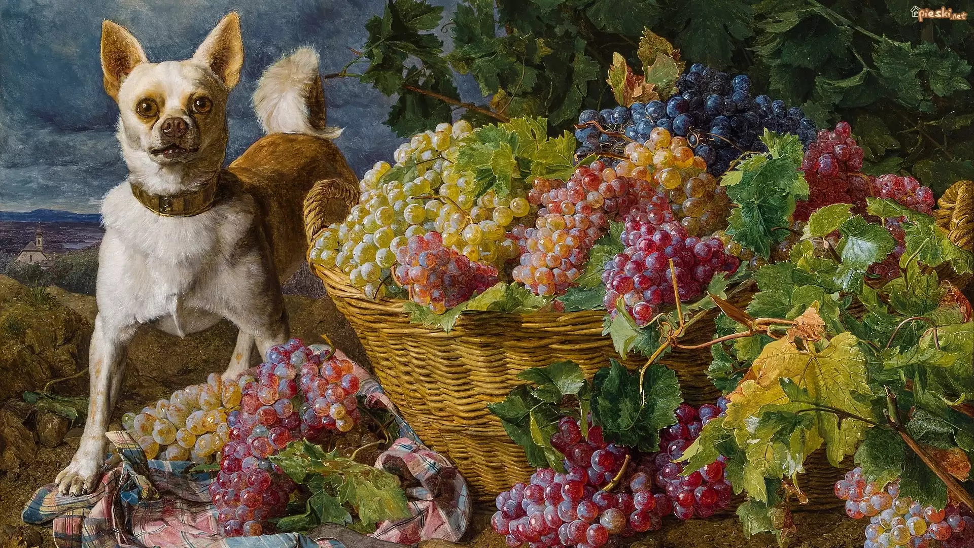 Pies Malarstwo, Obraz, Ferdinand Georg Waldmuller, Pies, Kosz, Winogrona