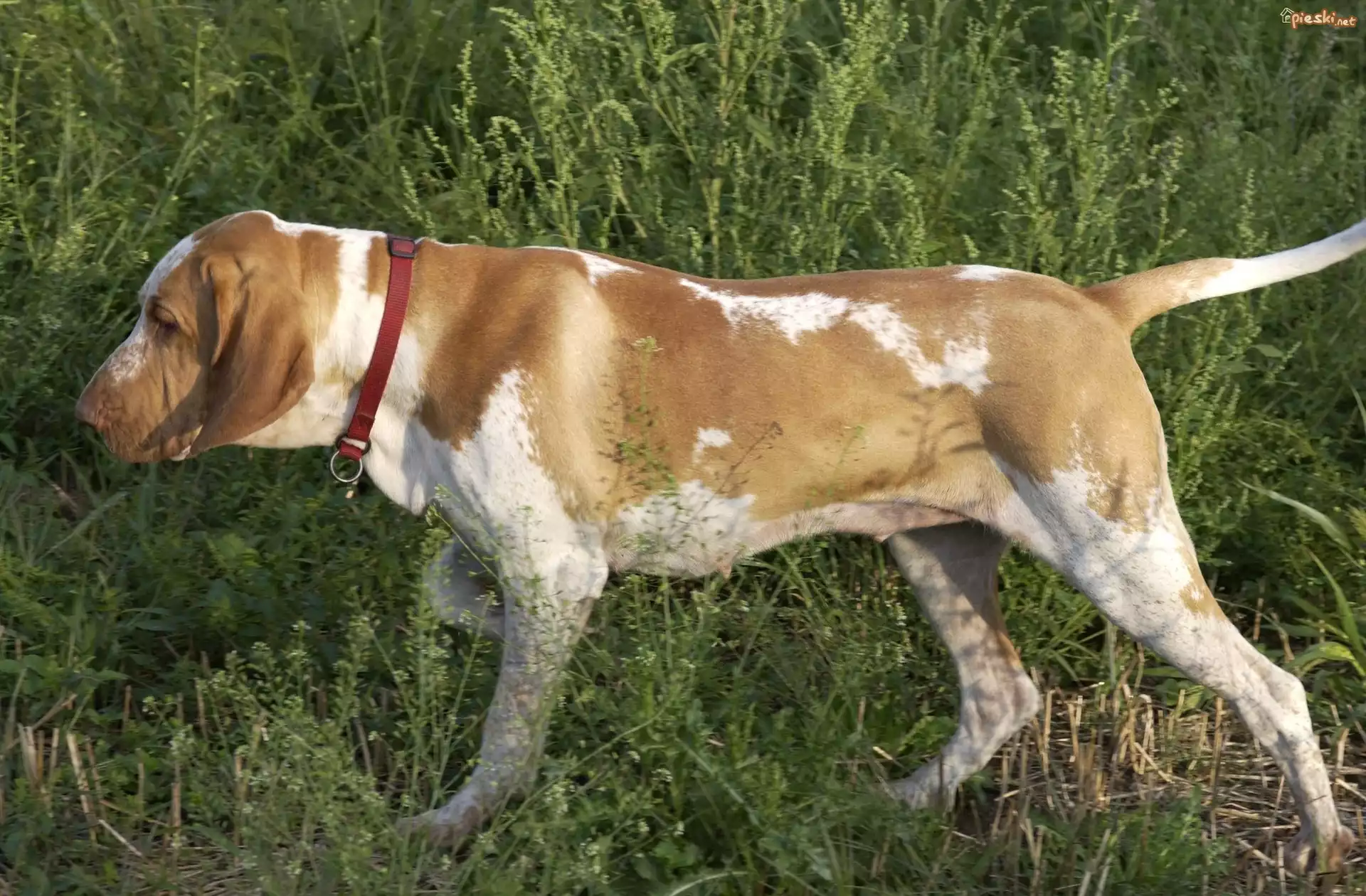 Wyżeł włoski krótkowłosy, Bracco italiano, czerwona, obroża, trawa