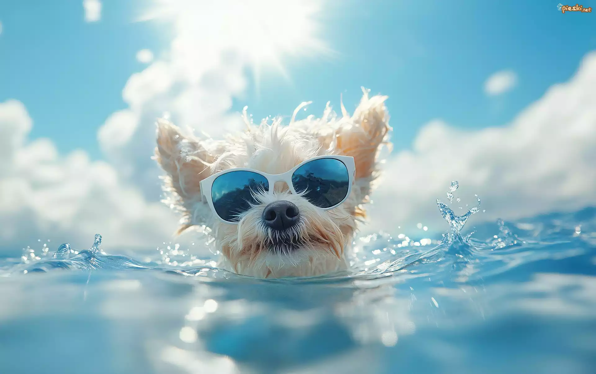 Pies Biały, Pies, Okulary, Woda