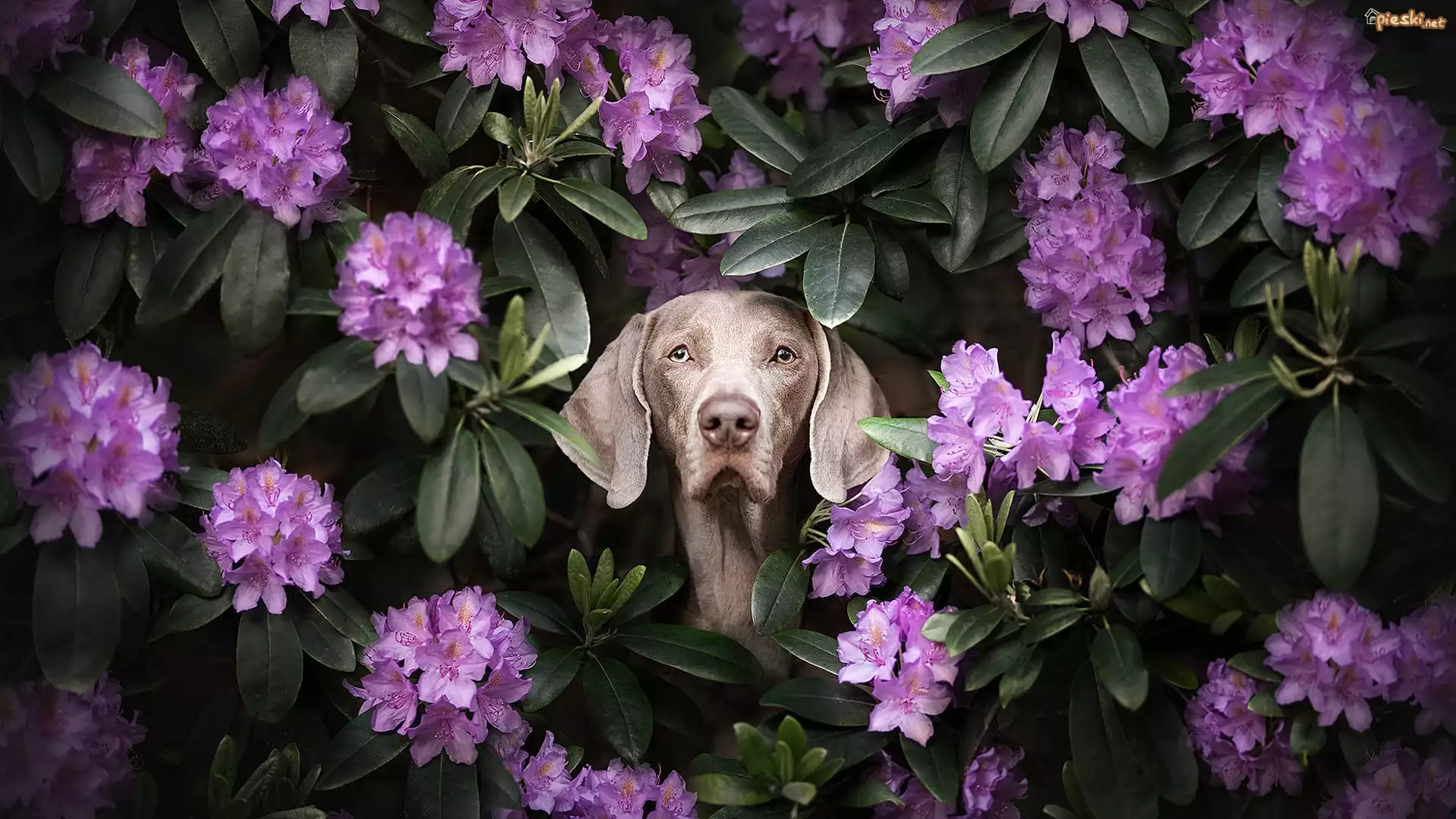 Pies Pies, Wyżeł weimarski, Kwiaty, Różanecznik