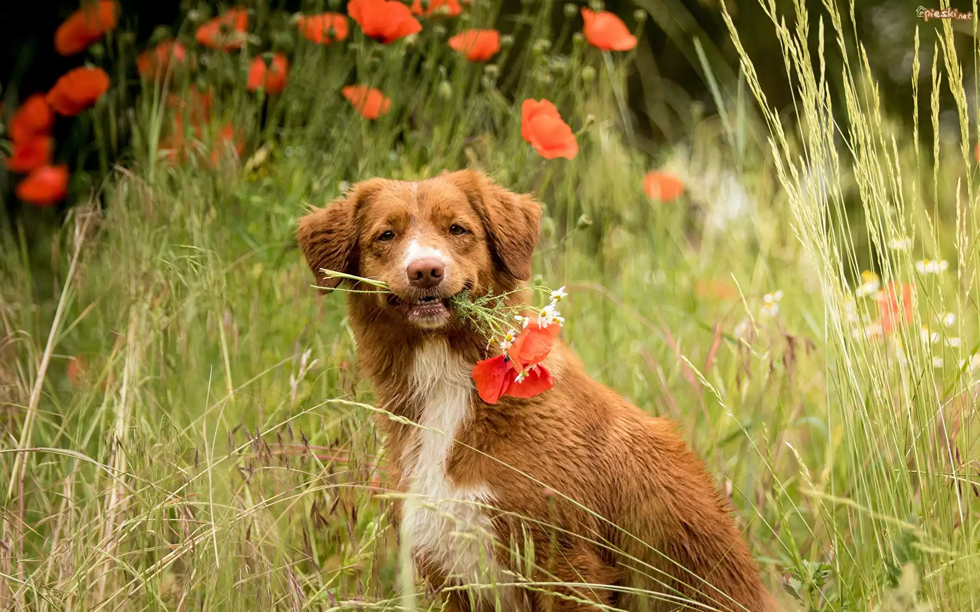 Pies, Retriever z Nowej Szkocji, Maki, Trawa Retriever z Nowej Szkocji