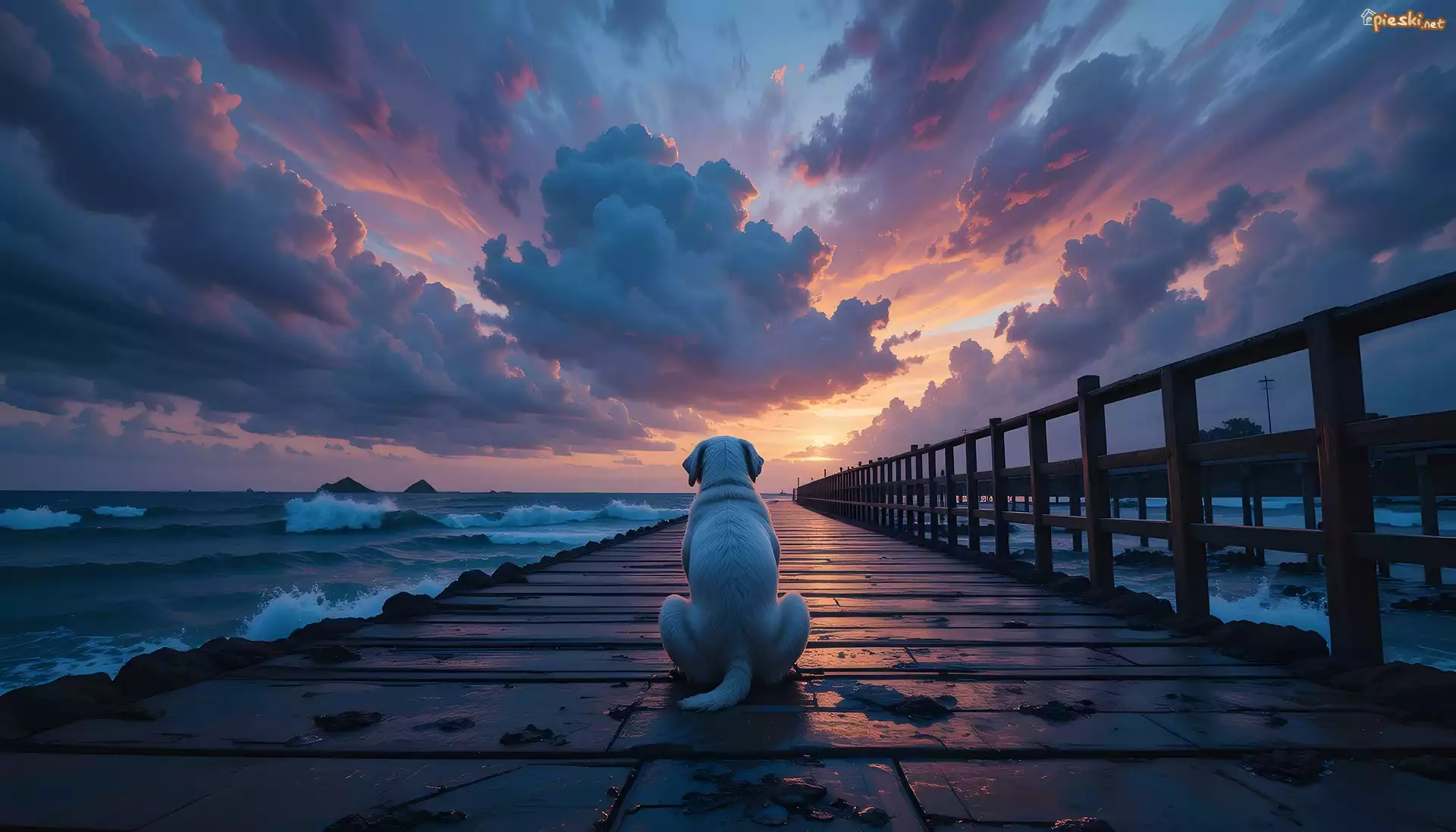 Pies Morze, Pies, Pomost, Zachód słońca, Chmury