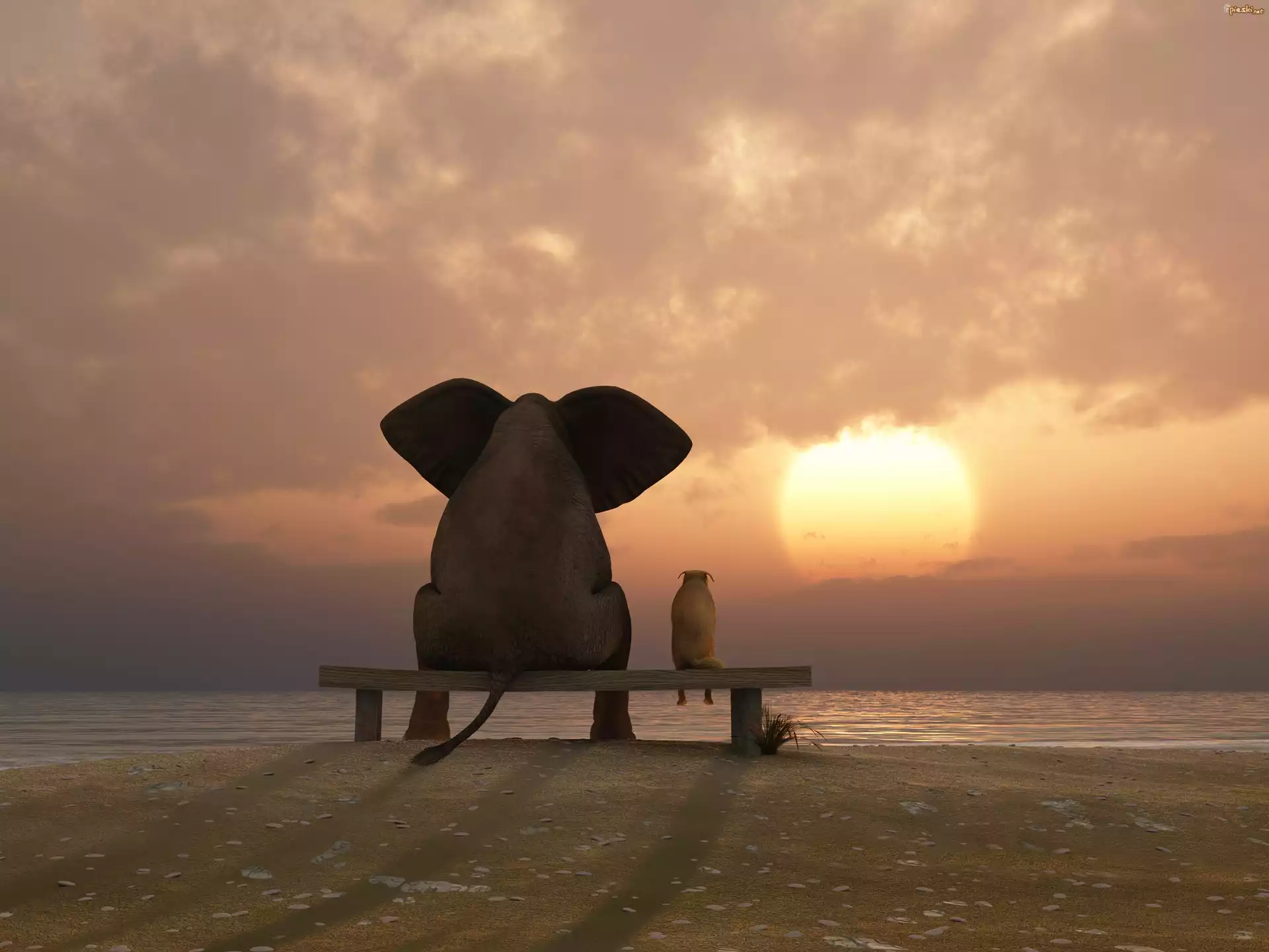 Zachód, Słońca, Morze, Słoń, Pies
