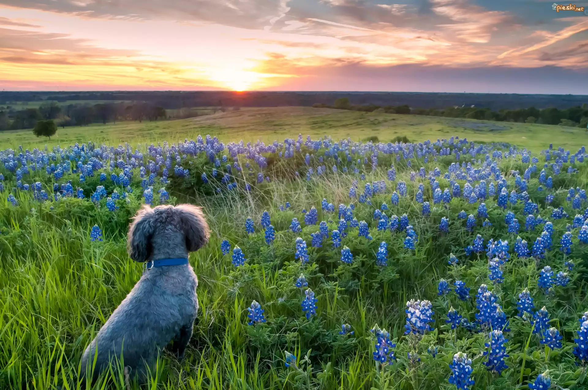 Pies Łąka, Łubin, Pies, Zachód, Słońca