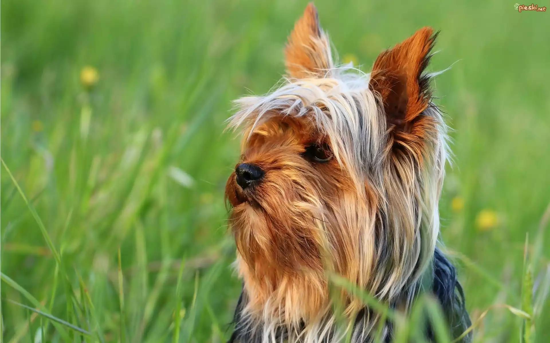 Pies Zapatrzony, Yorkshire, Terrier, Łąka, Trawa