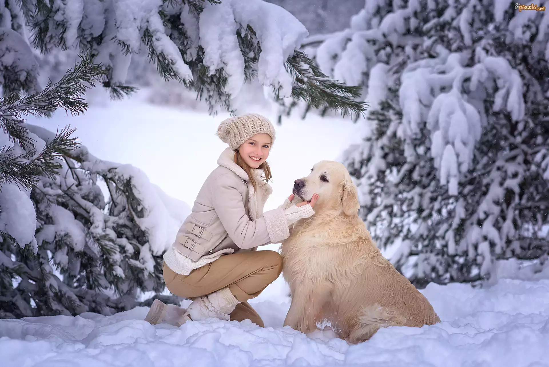 Pies Zima, Drzewa, Dziewczynka, Pies, Golden retriever