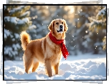 Zima, Pies, Golden retriever, Czerwony, Szalik, Śnieg, Grafika AI